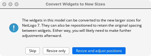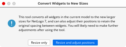 Note that opening an old model in NetLogo 7 will automatically prompt you to perform an automatic widget conversion, as shown in the dialog below.