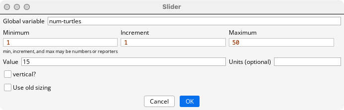 Jump sliders to click location (instead of incrementing): When checked, clicking anywhere in the slider bar of a slider widget will move the thumb to that location. When unchecked, the pre-NetLogo 7 behavior will be applied, and clicking in the slider bar will increase or decrease the value of the slider by one increment, depending on which side of the bar is clicked.