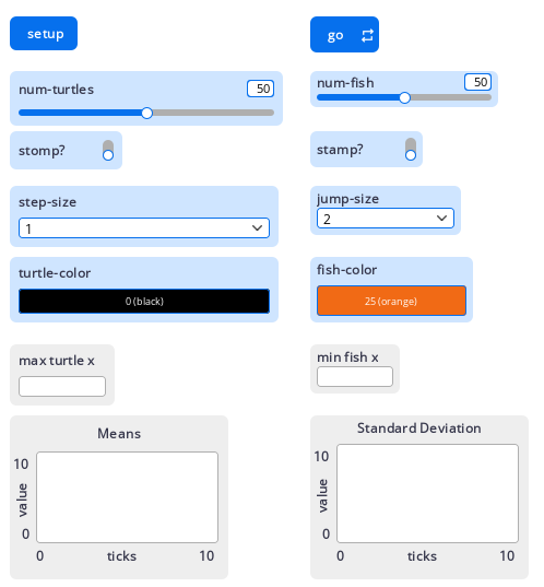 Buttons perform actions when clicked. The input widgets are: sliders, switches, choosers and inputs. The output widgets are: monitors, plots and the output area. Notes are used to add labels, instructions and other information to the interface. Buttons and input widgets are colored shades of blue. Output widgets are shades of grey. Widgets by and large perform as they did in previous releases of NetLogo. A new feature of the slider is a text box in which values can be added directly. A new feature of the Notes is that the user can set both the text color and the background color for both light and dark mode.
